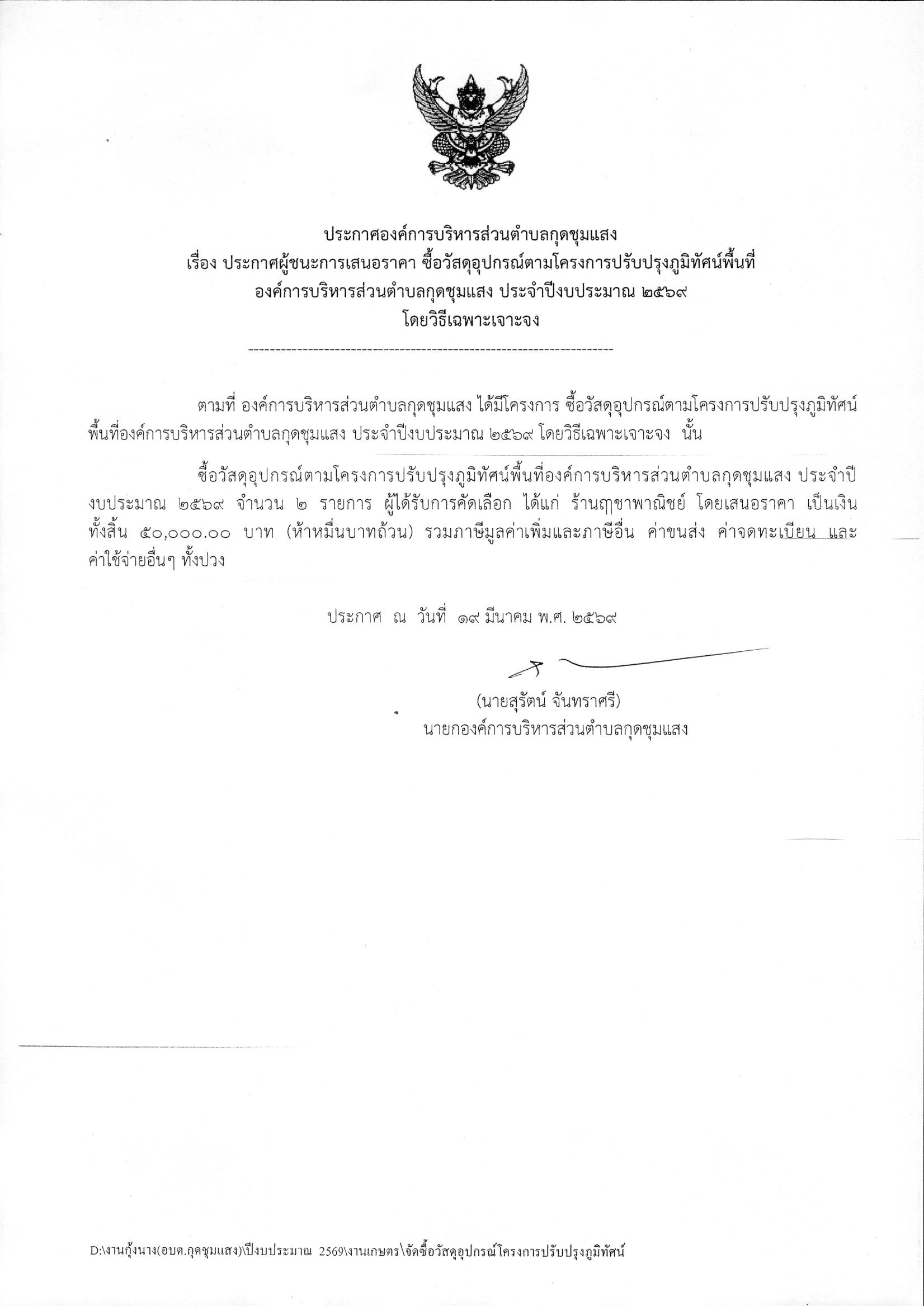 | 48 | ประกาศผู้ชนะเสนอราคา จ้างป้ายไวนิล ภาษีที่ดินและสิ่งปลูกสร้างและภาษีป้าย |  | 10 ก.พ. 2569 | 9 |