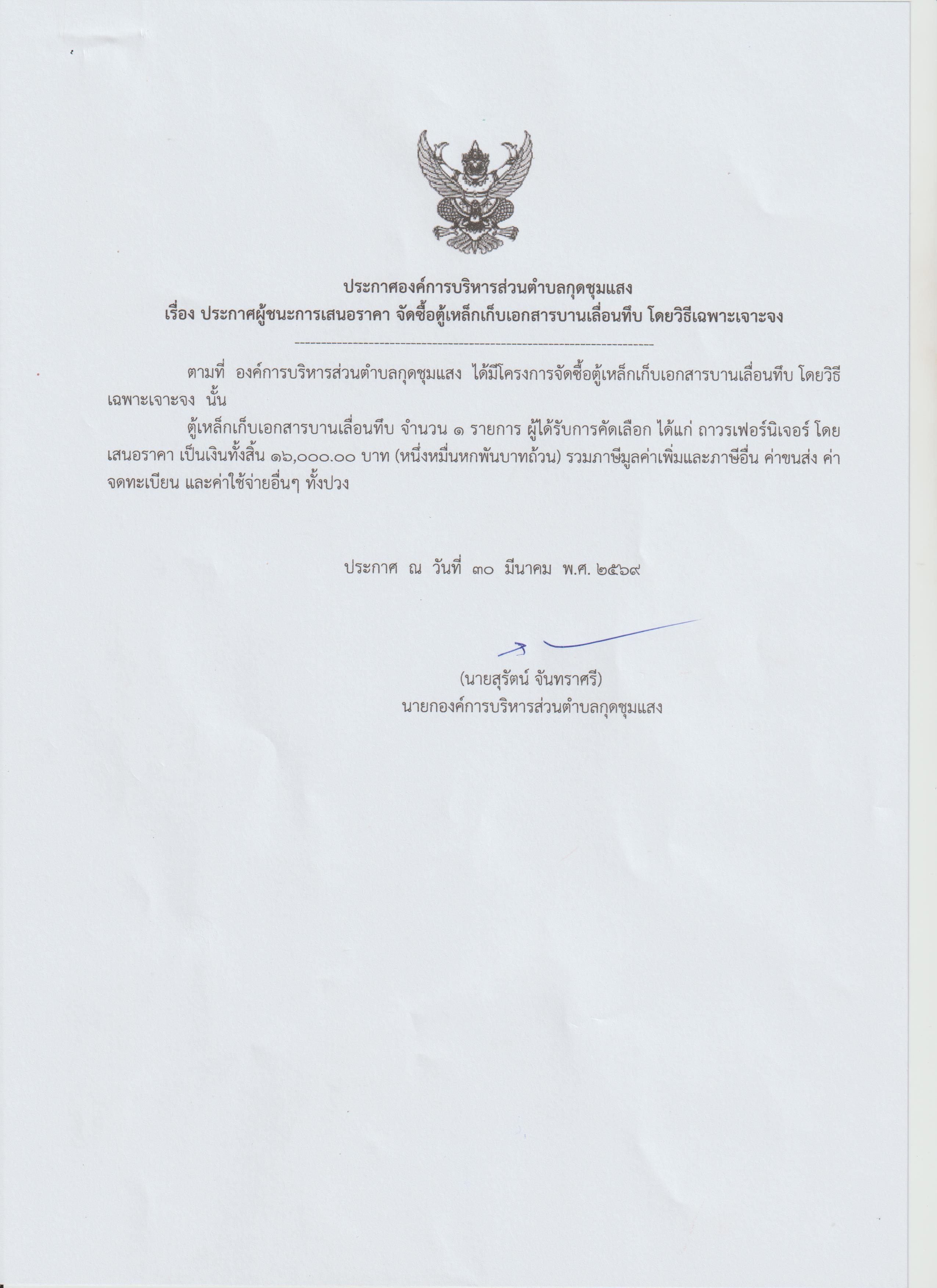 | 12 | ประกาศผู้ชนะการเสนอราคา จัดซื้อตู้เหล็กเก็บเอกสารบานเลื่อนทึบ โดยวิธีเฉพาะเจาะจง |  | 30 มี.ค. 2569 | 1 |