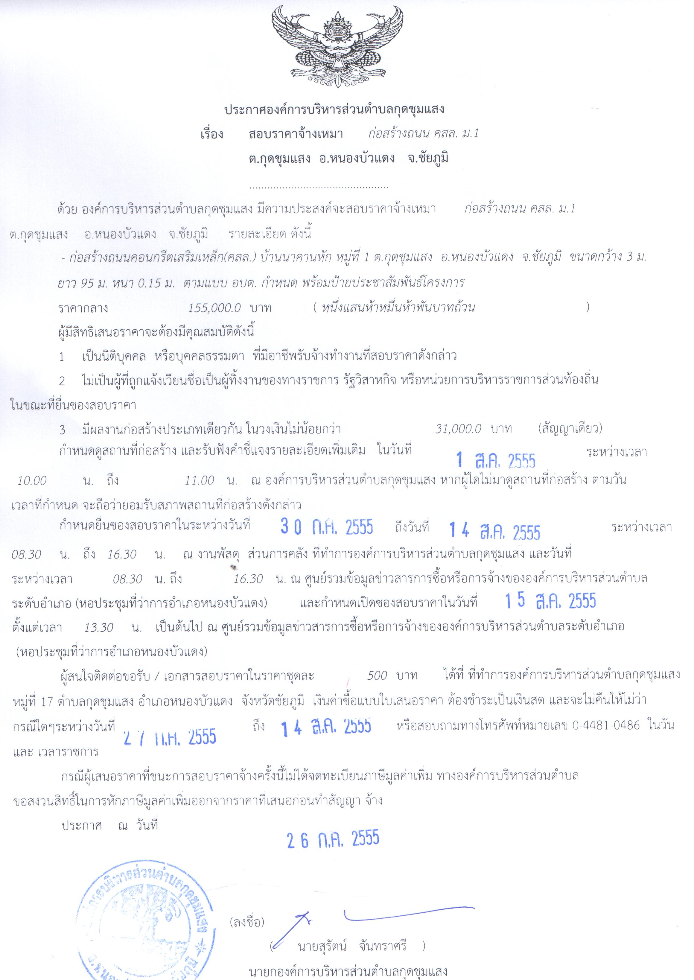 ประกาศ เรื่อง สอบราคาจ้างเหมาก่อสร้างถนนคสล.หมู่ 1