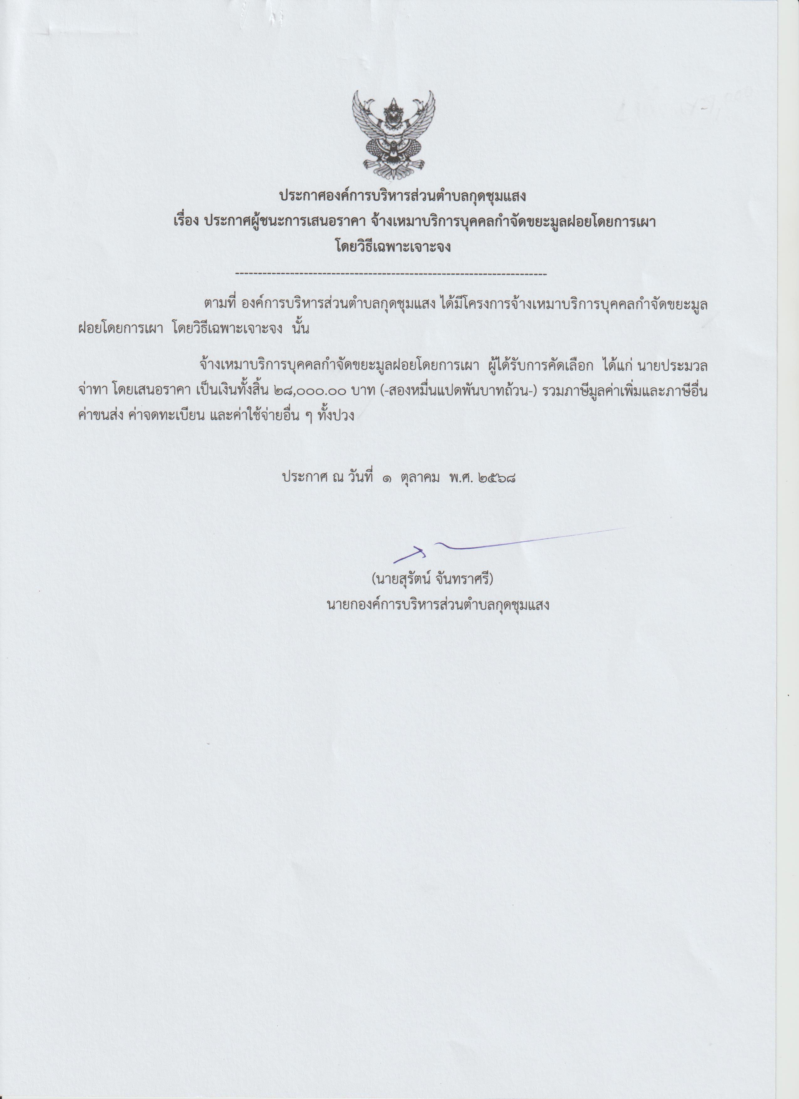 ประกาศผู้ชนะการเสนอราคา จ้างเหมาบริการบุคคลกำจัดขยะมูลฝอยโดยการเผา โดยวิธีเฉพาะเจาะจง