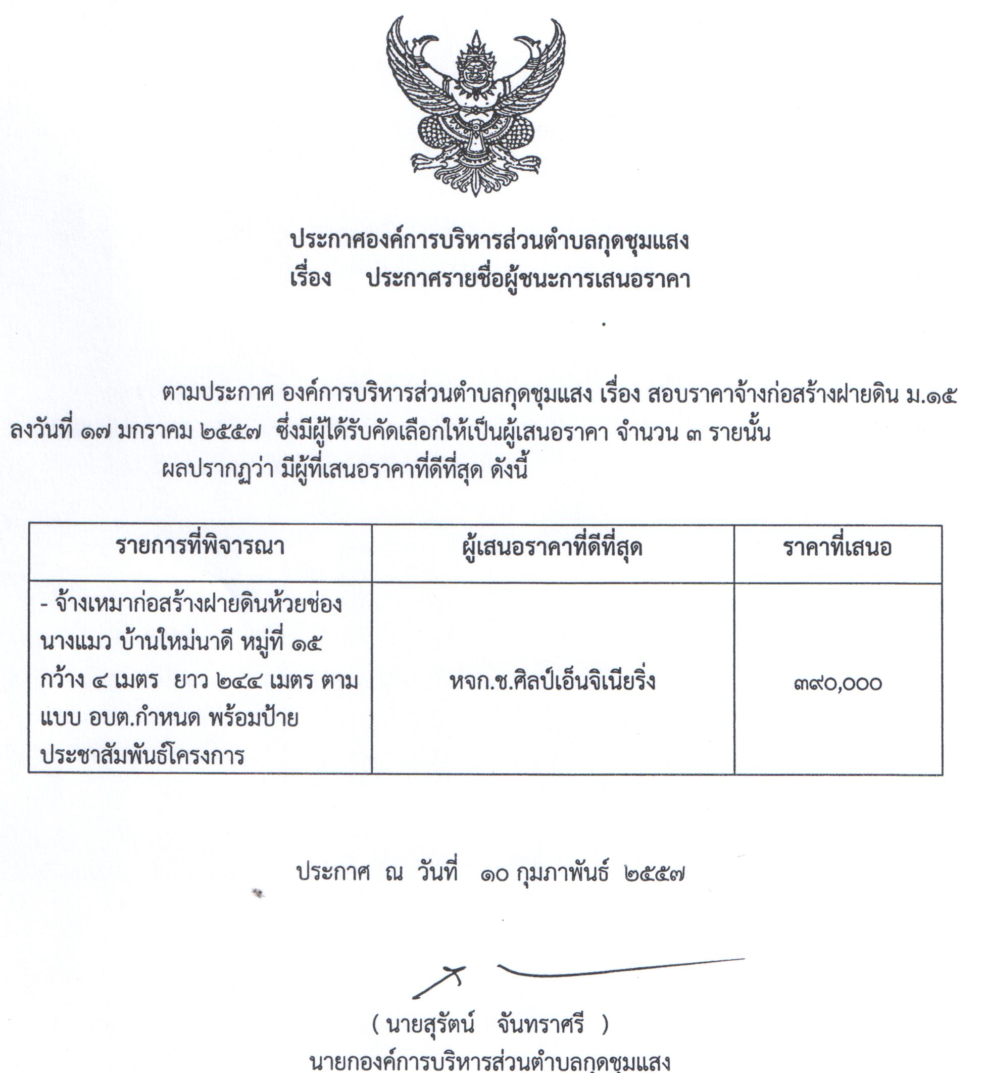 ประกาศรายชื่อผู้ชนะการเสนอราคา