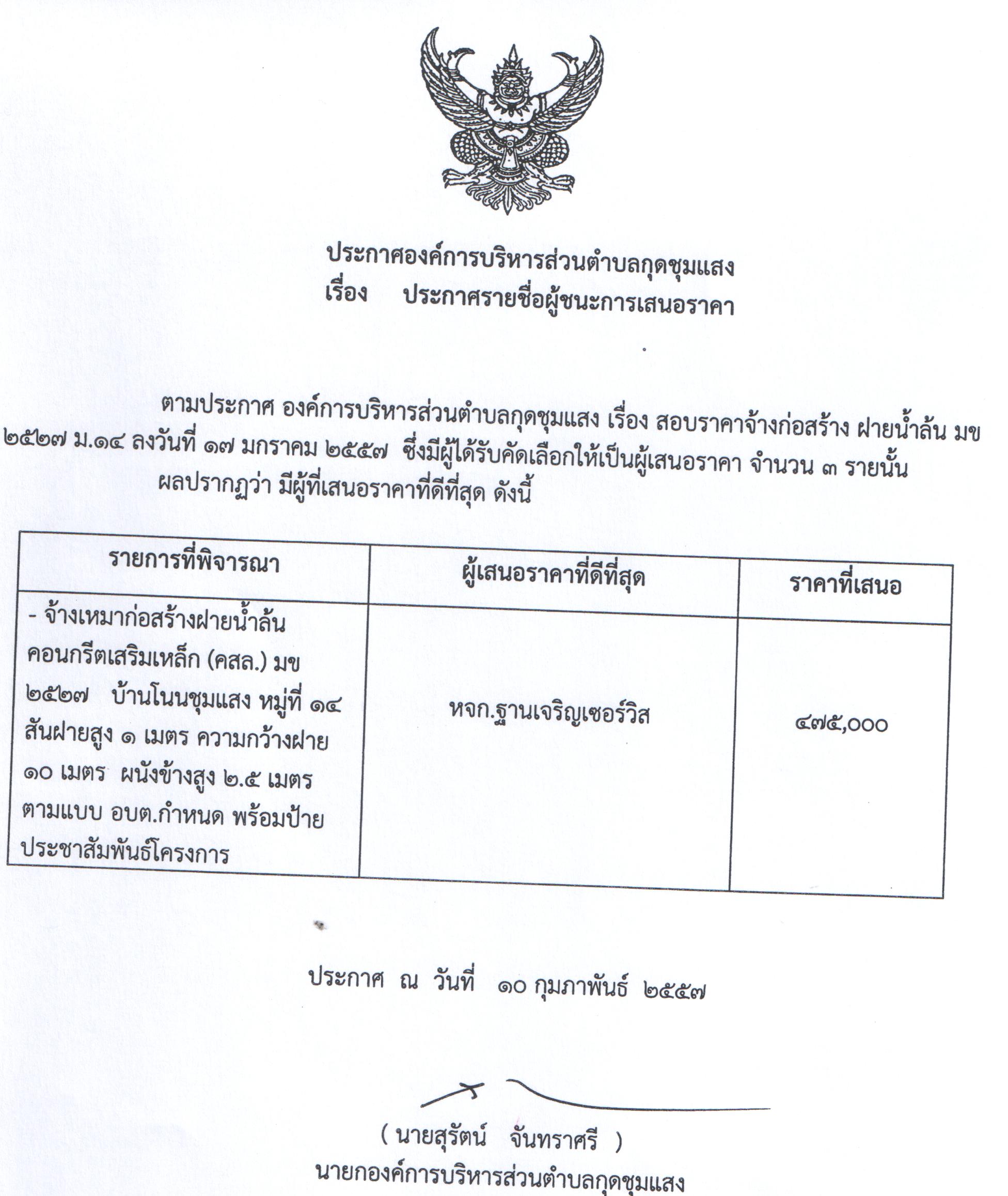 ประกาศรายชื่อผู้ชนะการเสนอราคา