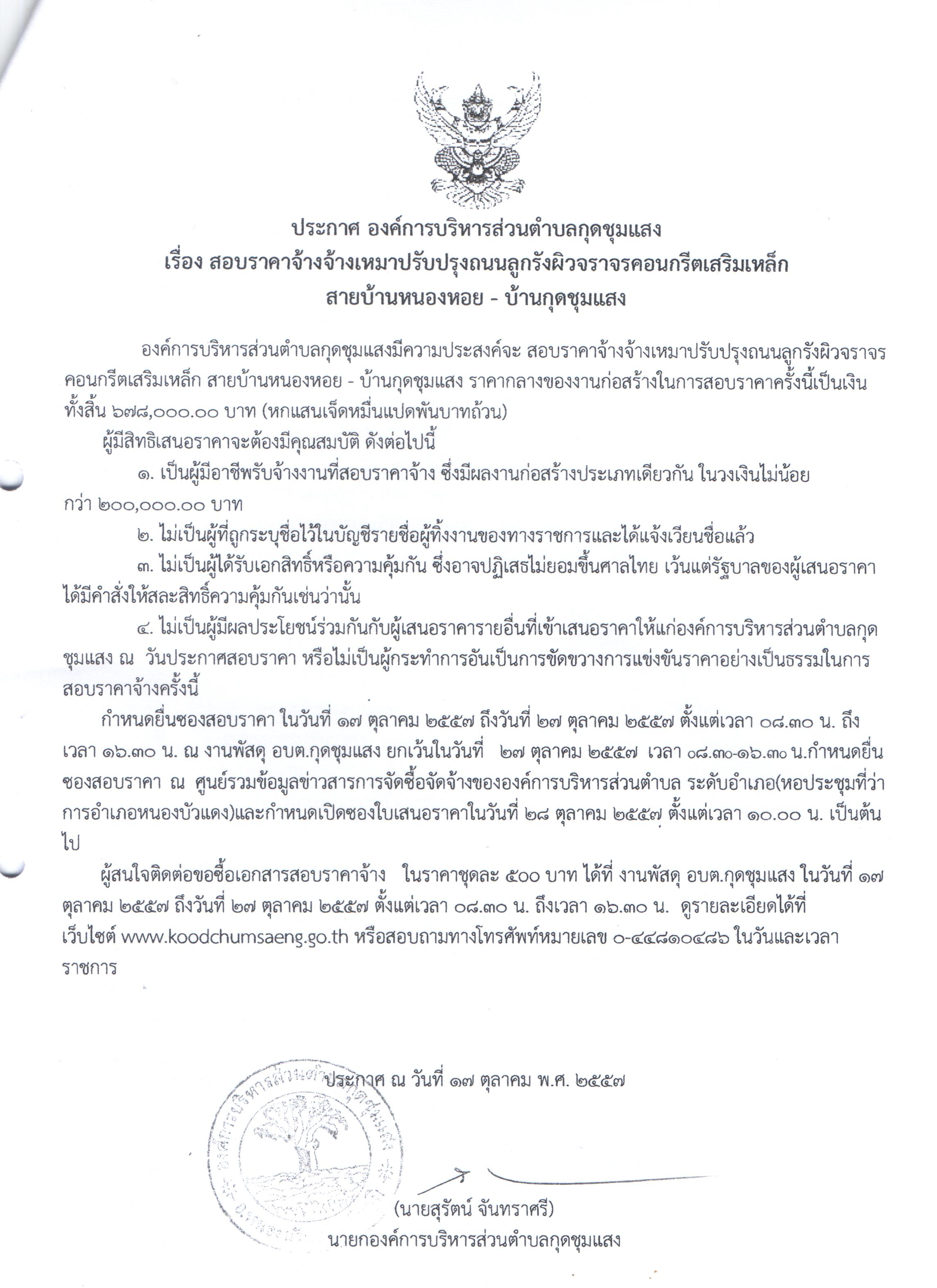 สอบราคาจ้างจ้างเหมาปรับปรุงถนนลูกรังผิวจราจรคอนกรีตเสริมเหล็กสายบ้านหนองหอย-กุดชุมแสง