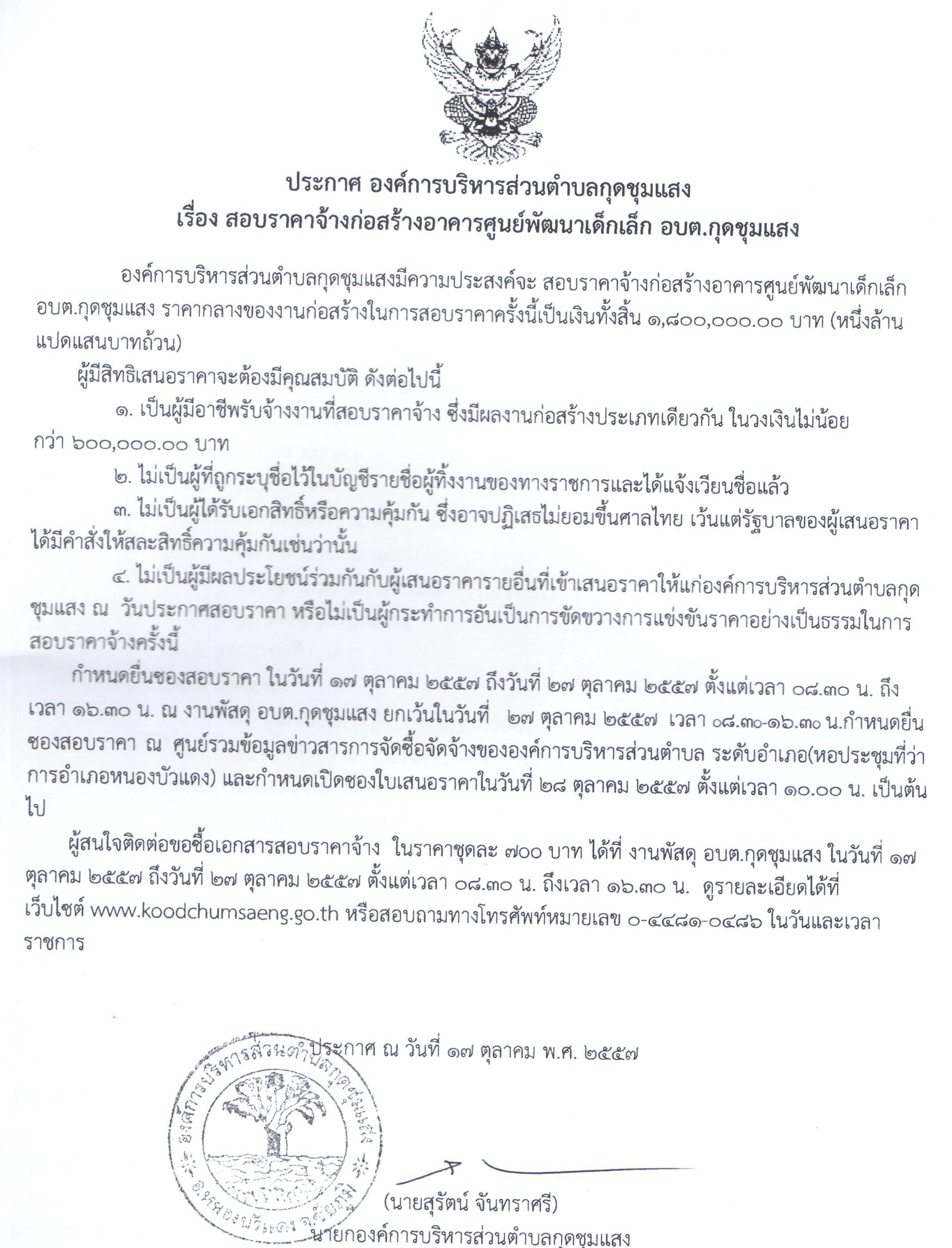 สอบราคาจ้างก่อสร้างอาคารศูนย์พัฒนาเด็กเล็ก อบต.กุดชุมแสง