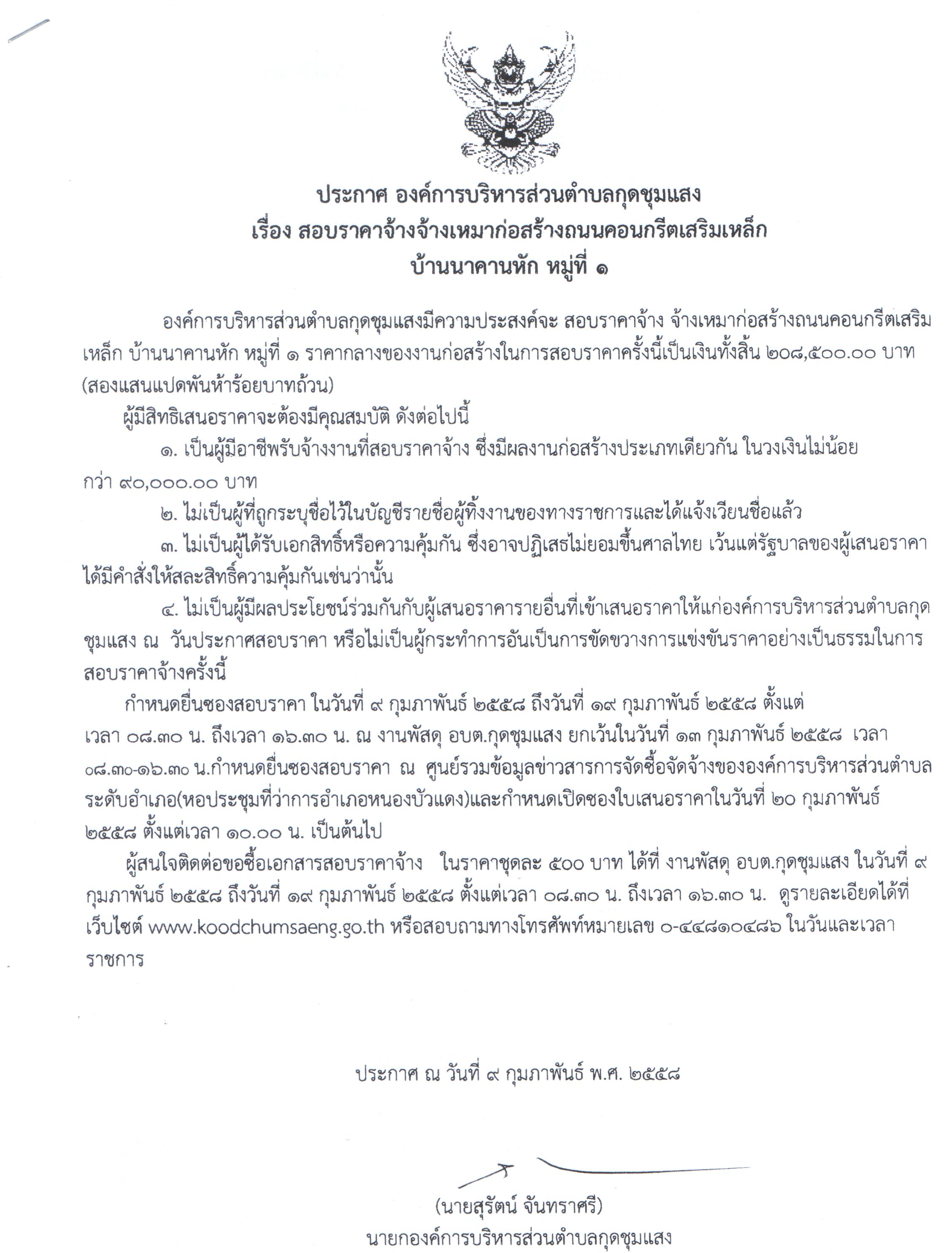 สอบราคาจ้าง จ้างเหมาก่อสร้างถนนคอนกรีตเสริมเหล็ก บ้านนาคานหัก หมู่ที่1ฯ