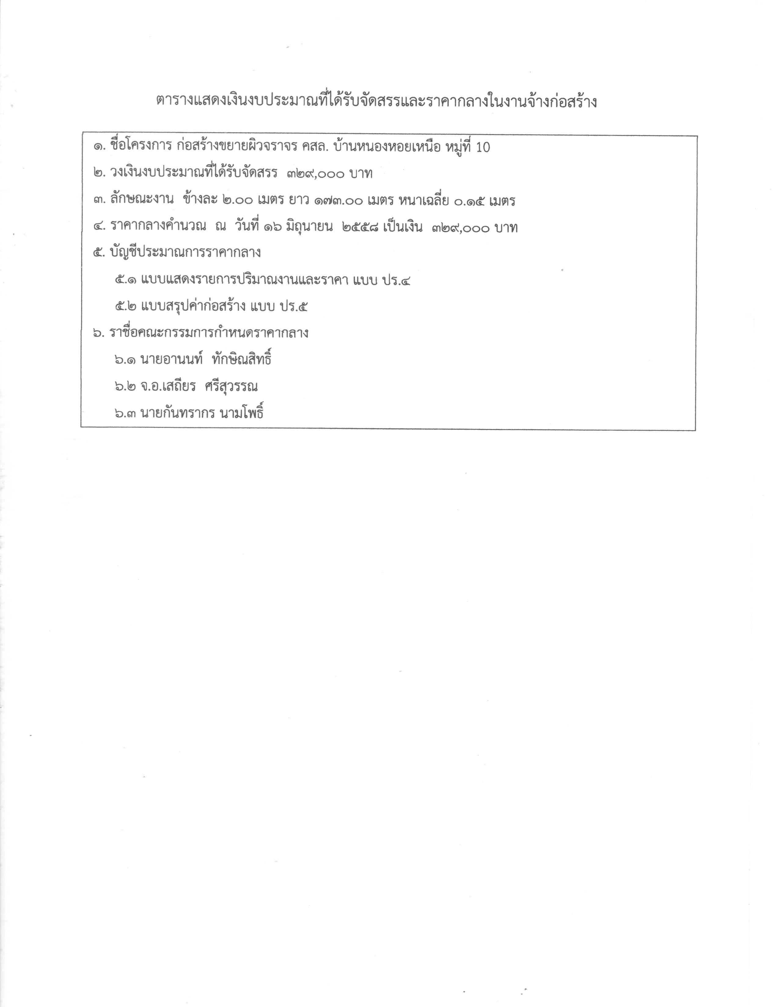ราคากลางในงานจ้างก่อสร้าง โครงการ ก่อสร้างขยายผิวจราจร คสล. บ.หนองหอยเหนือ ม.10