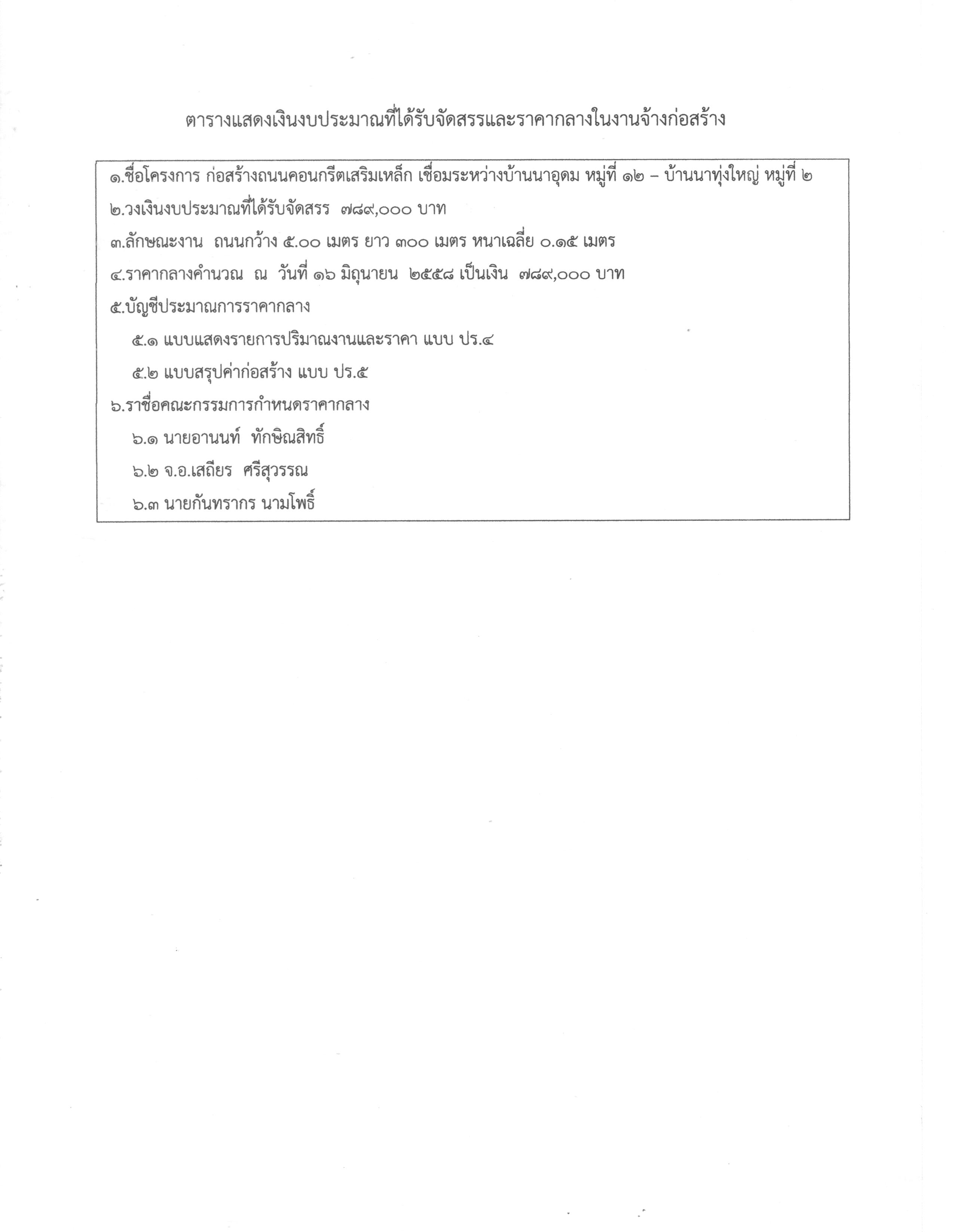 ราคากลางในงานจ้างก่อสร้าง โครงการก่อสร้างถนนคอนกรีตเสริมเหล็ก เชื่อมระหว่างบ.นาอุดม ม.12-ม.2