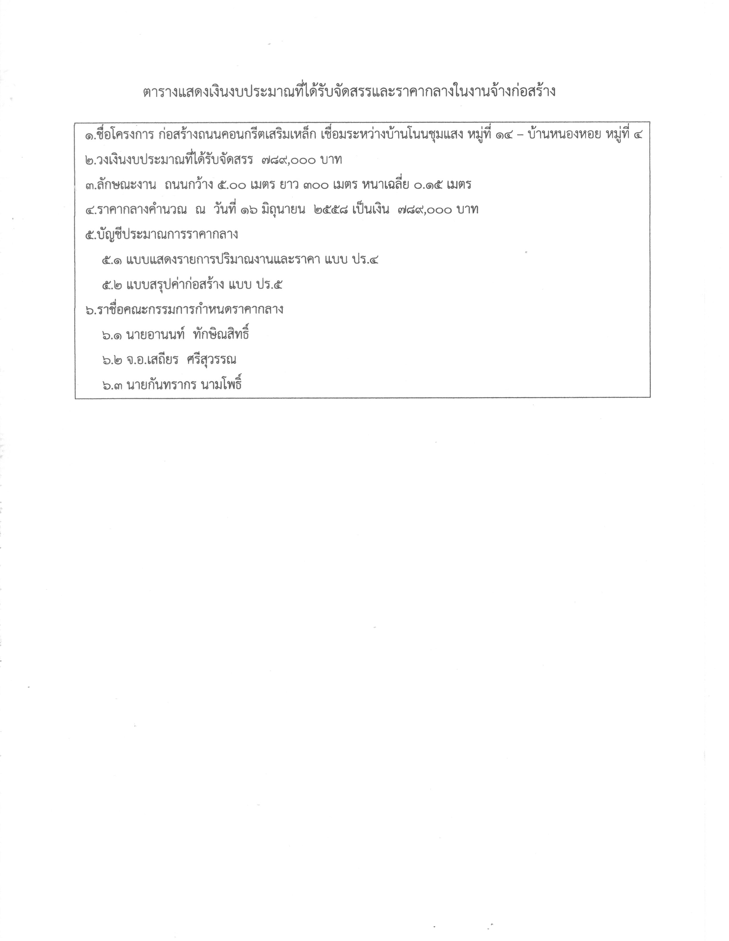 ราคากลางในงานจ้างก่อสร้าง โครงการก่อสร้างถนนคอนกรีตเสริมเหล็ก เชื่อมระหว่างบ.โนนชุมแสง ม.14- บ.หนองหอย ม.4