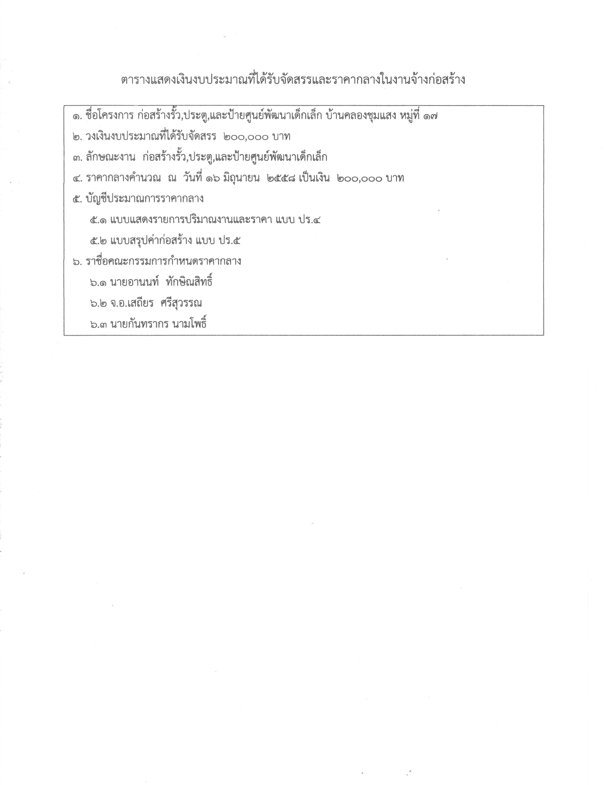 ราคากลางในงานจ้างก่อสร้าง โครงการ ก่อสร้างรั้ว ประตูและป้ายศูนย์พัฒนาเด็กเล็ก บ.คลองชุมแสง ม.17