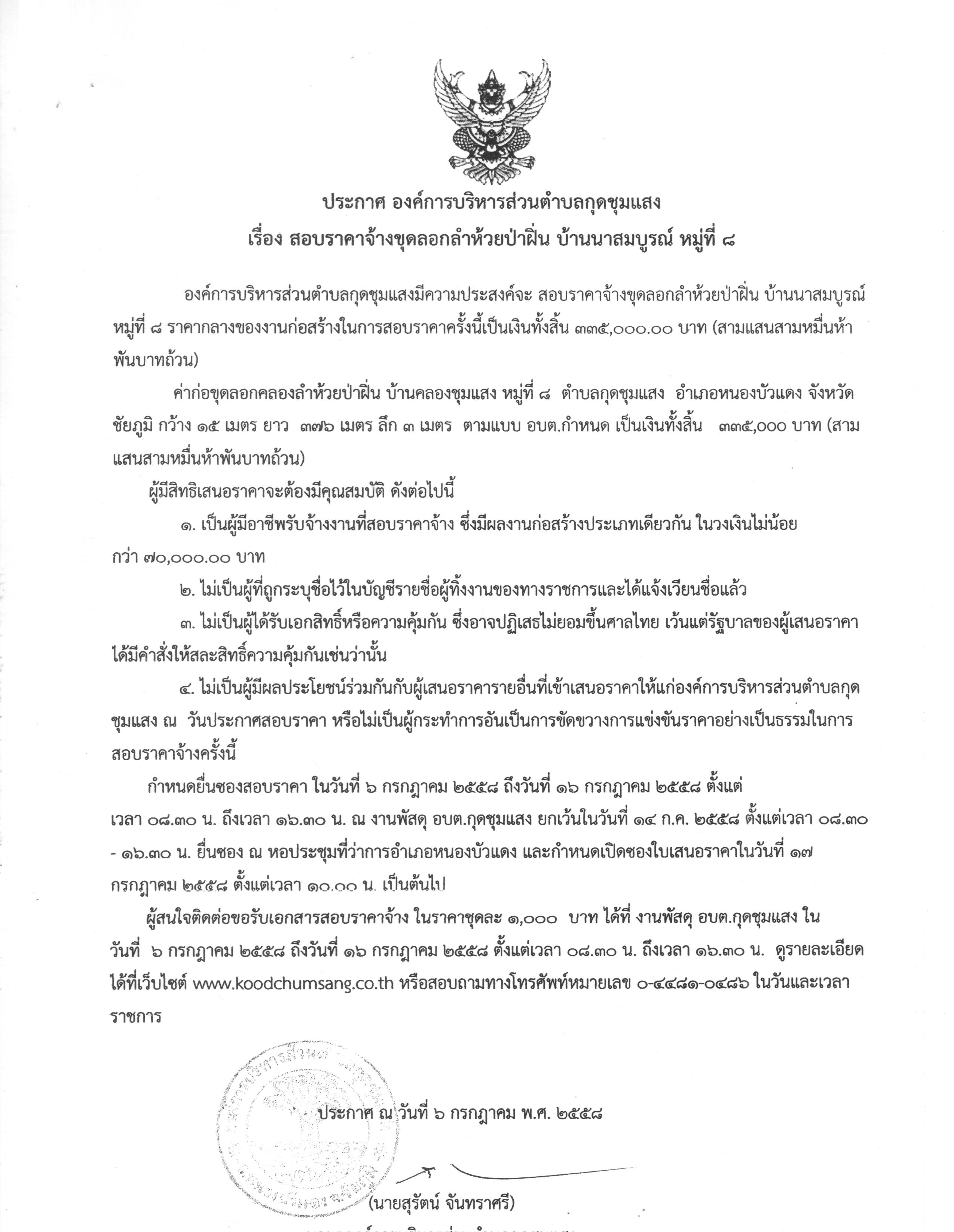 ประกาศสอบราคาจ้างขุดลอกลำห้วยป่าฝิ่น บ.นาสมบูรณ์ ม.8