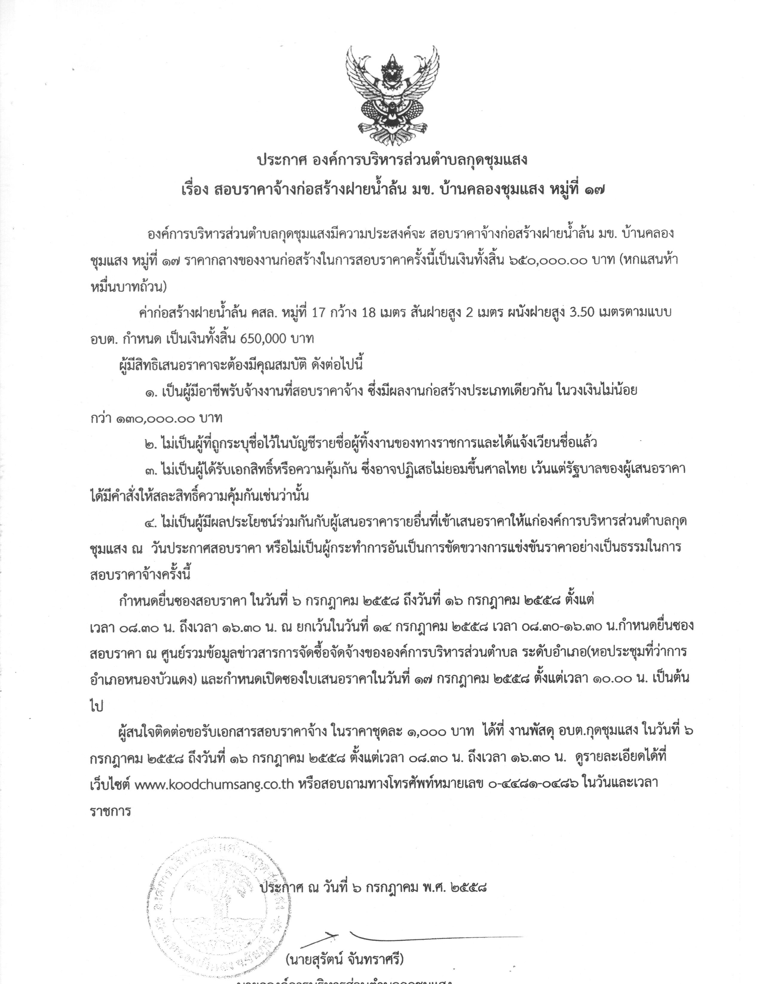 ประกาศสอบราคาจ้างก่อสร้างฝายน้ำล้น มข.บ.คลองชุมแสง ม.17