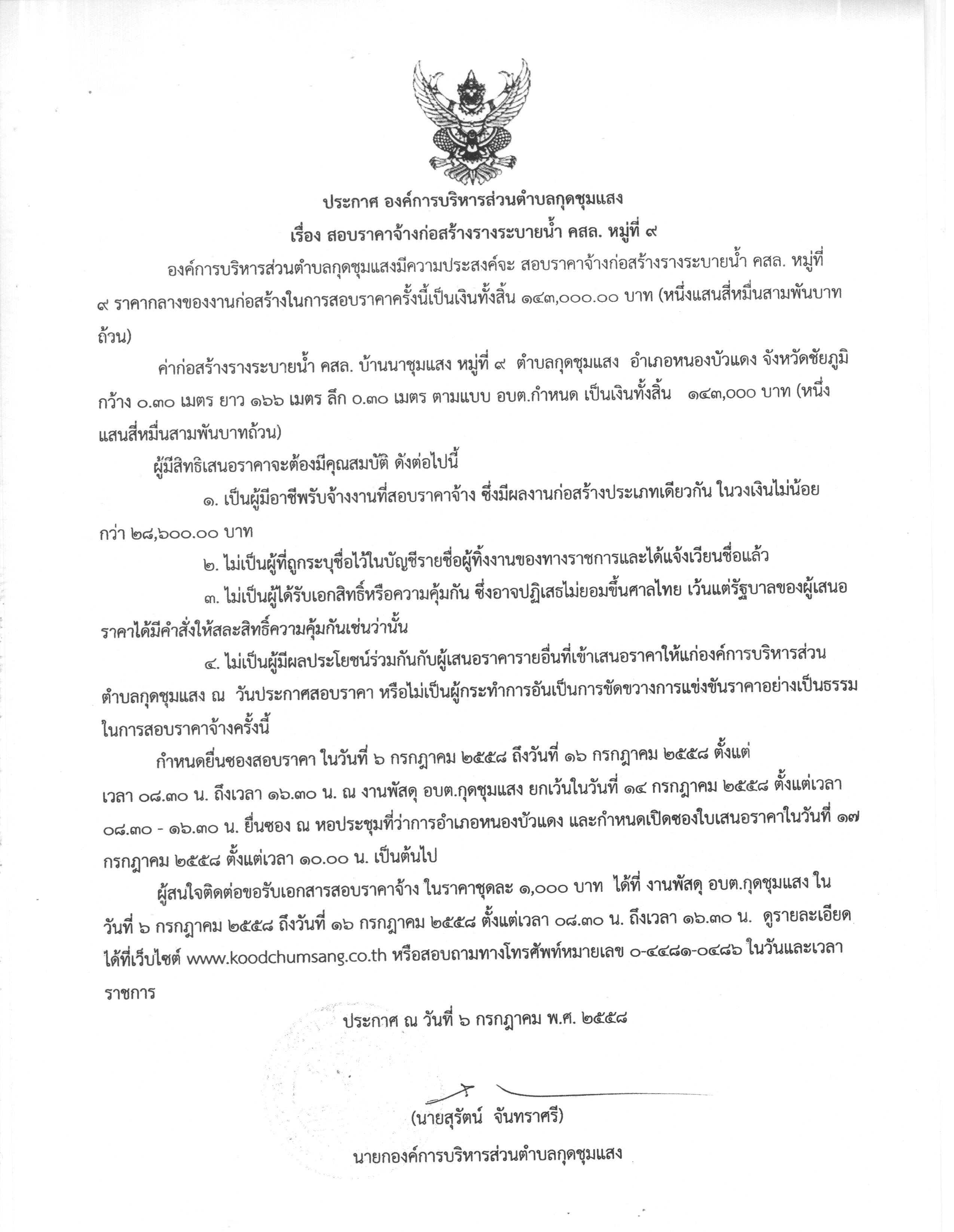 ประกาศสอบราคาจ้างก่อสร้างรางระบายน้ำ คสล.ม.9