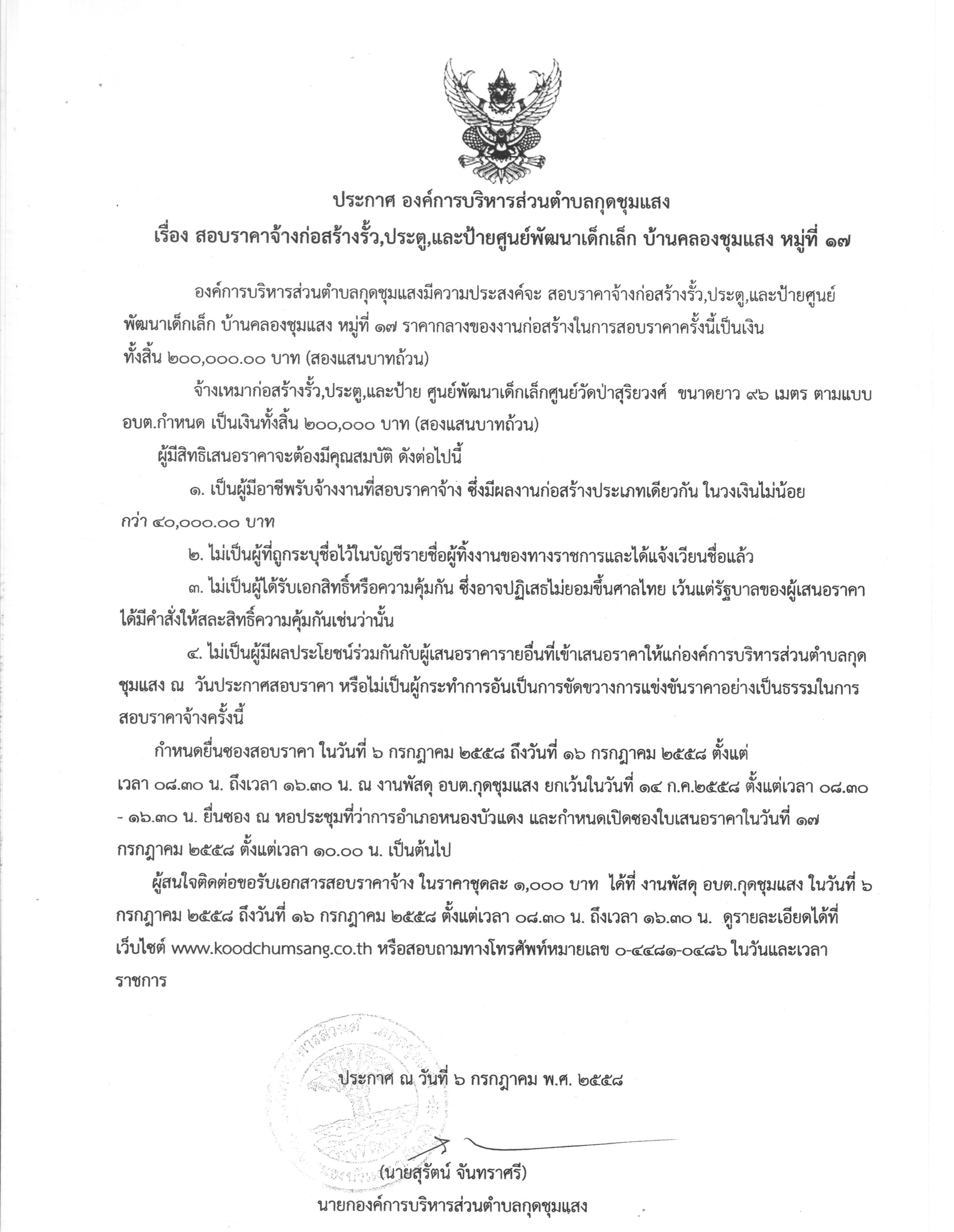 สอบราคาจ้างก่อสร้างรั้ว ประตู และป้ายศูนย์พัฒนาเด็กเล็ก บ.คลองชุมแสง ม.17