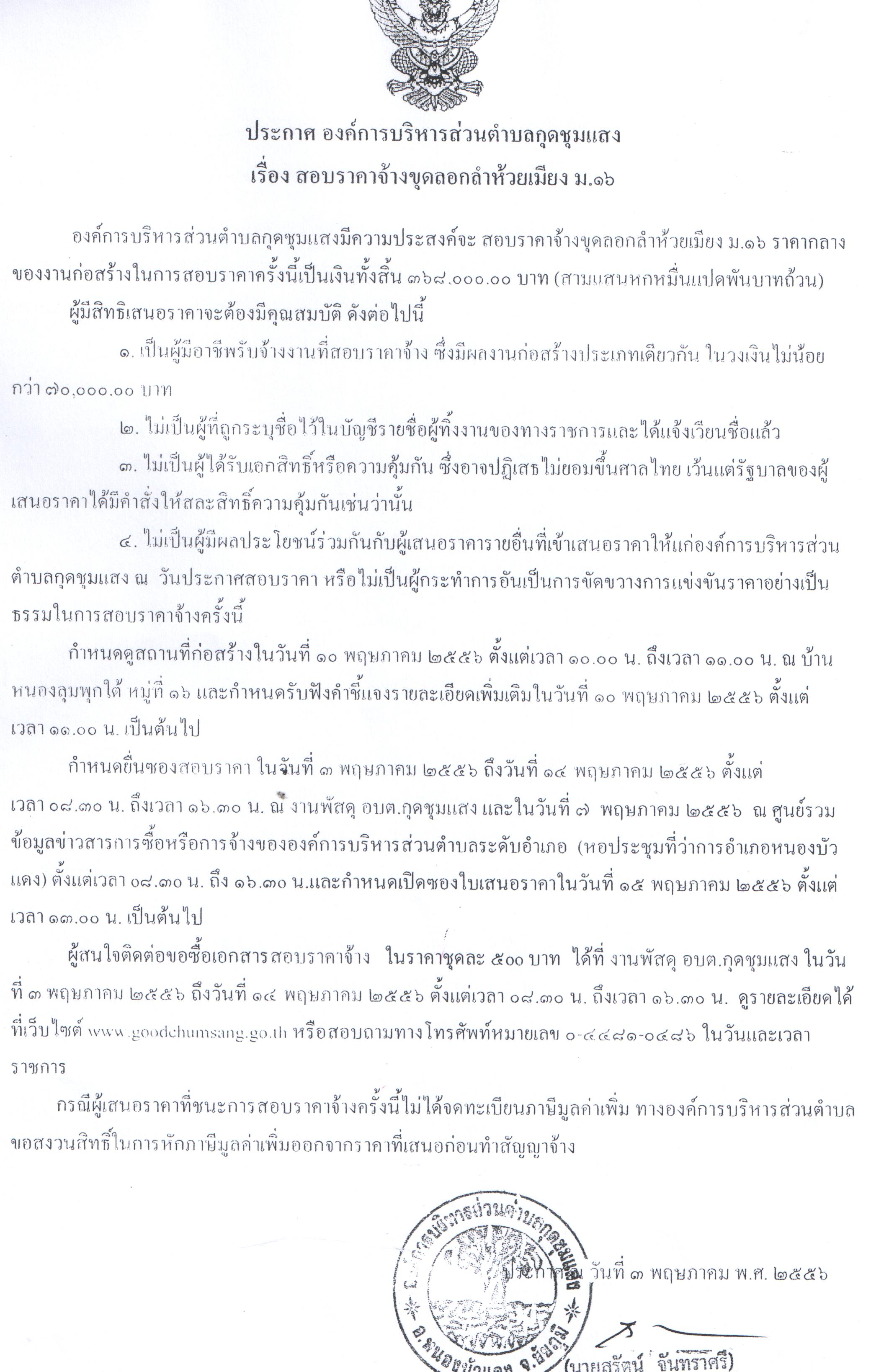 ประกาศองค์การบริหารส่วนตำบลกุดชุมแสง เรื่องสอบราคาจ้างขุดลอกลำห้วยเมียง ม.16