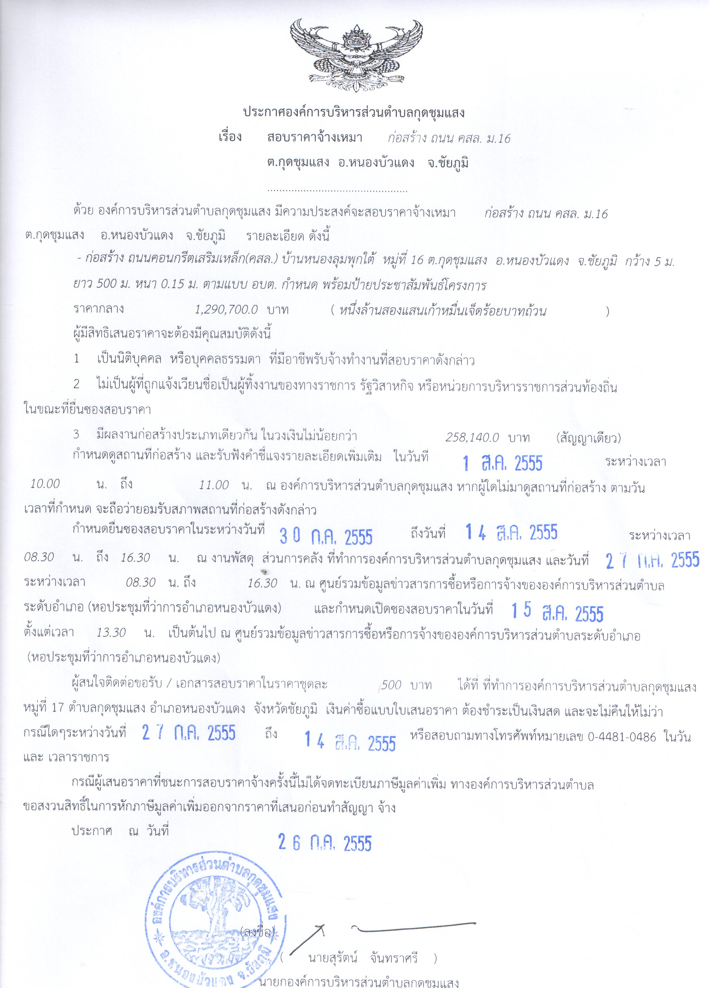 ประกาศ เรื่อง สอบราคาจ้างเหมา ก่อสร้าง ถนนคสล.หมู่ 16