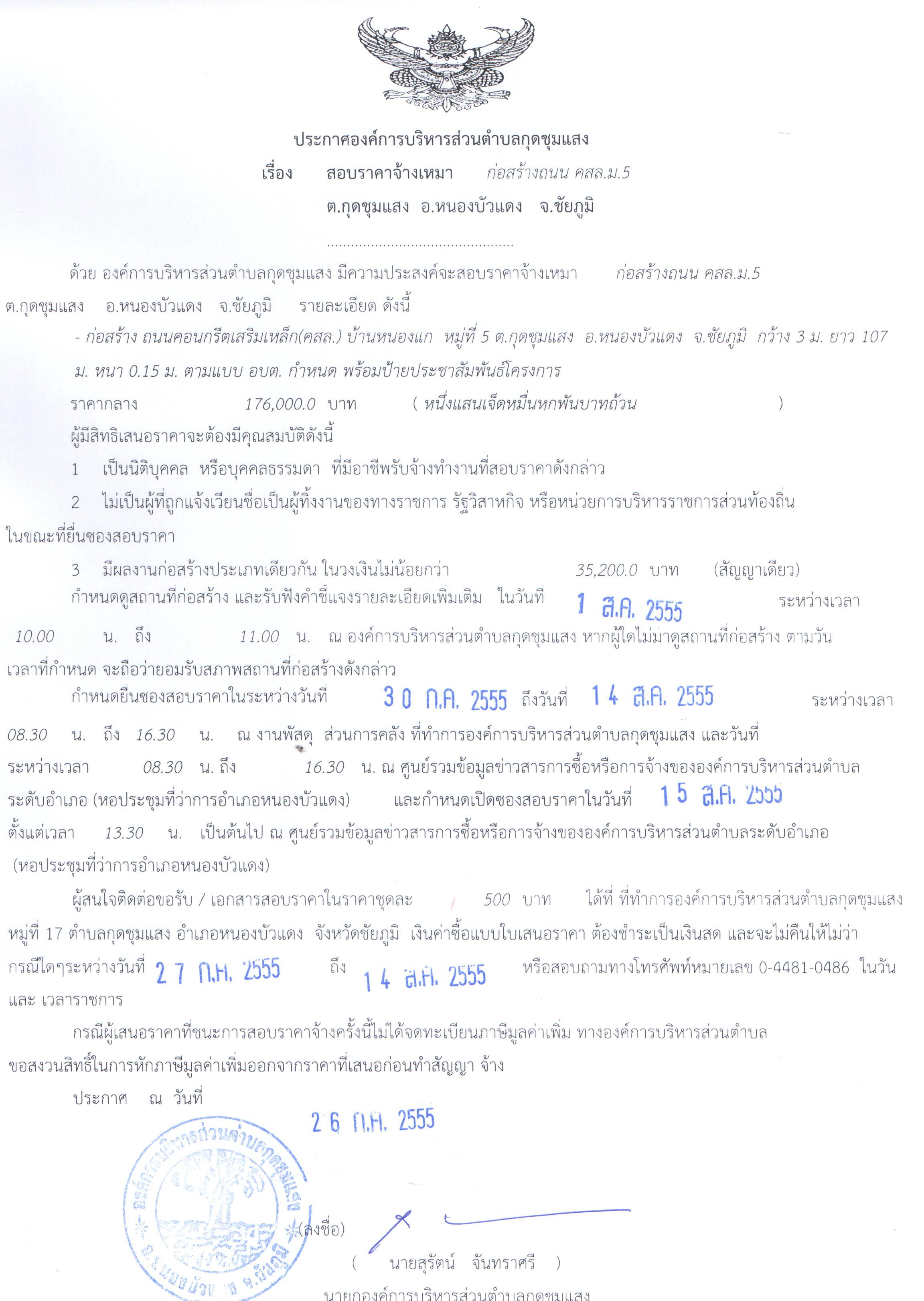 ประกาศ เรื่อง สอบราคาจ้างเหมา ก่อสร้างถนน คสล.หมู่ 5