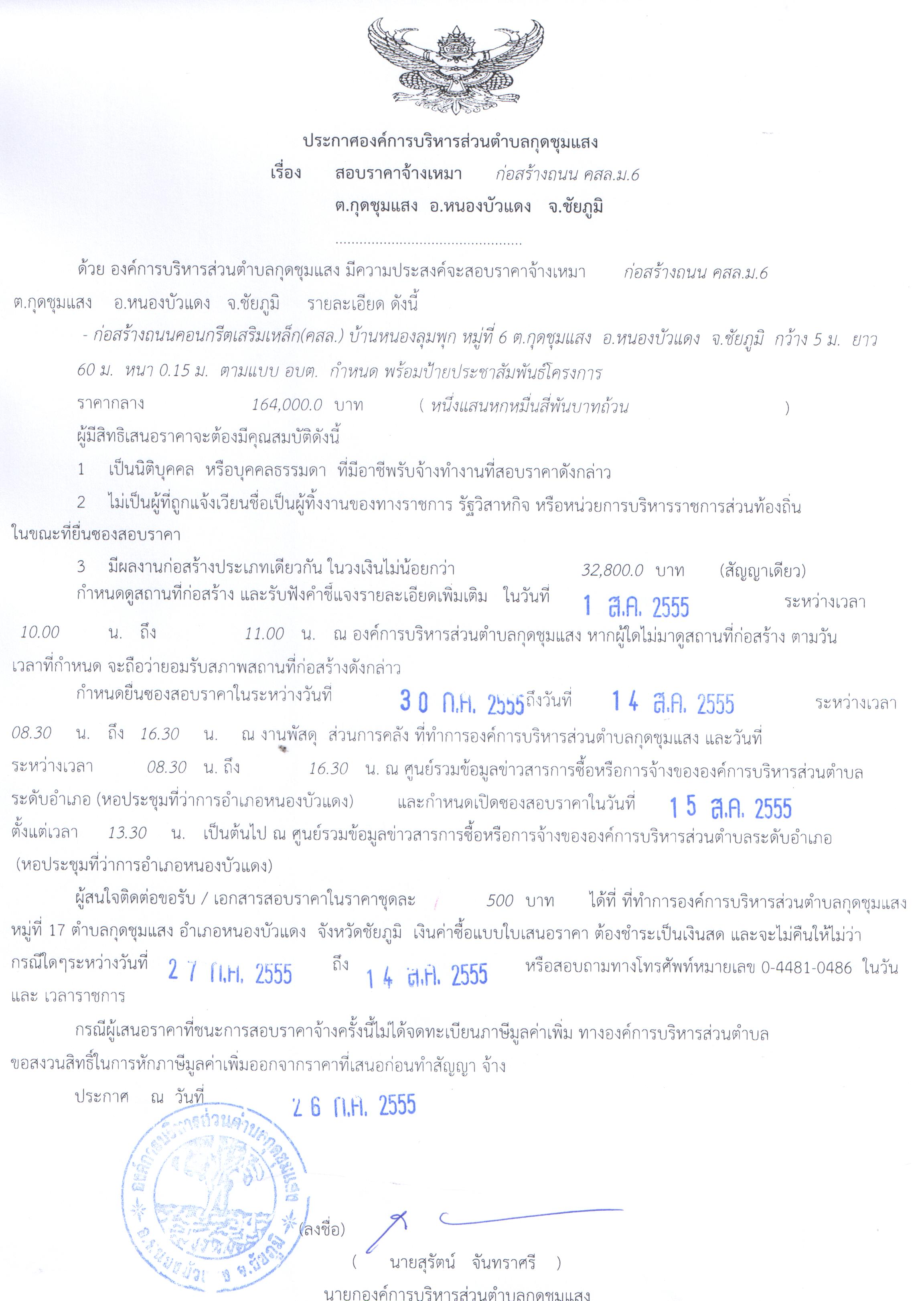 ประกาศ เรื่อง สอบราคาจ้างเหมา ก่อสร้างถนน คสล.หมู่ 6