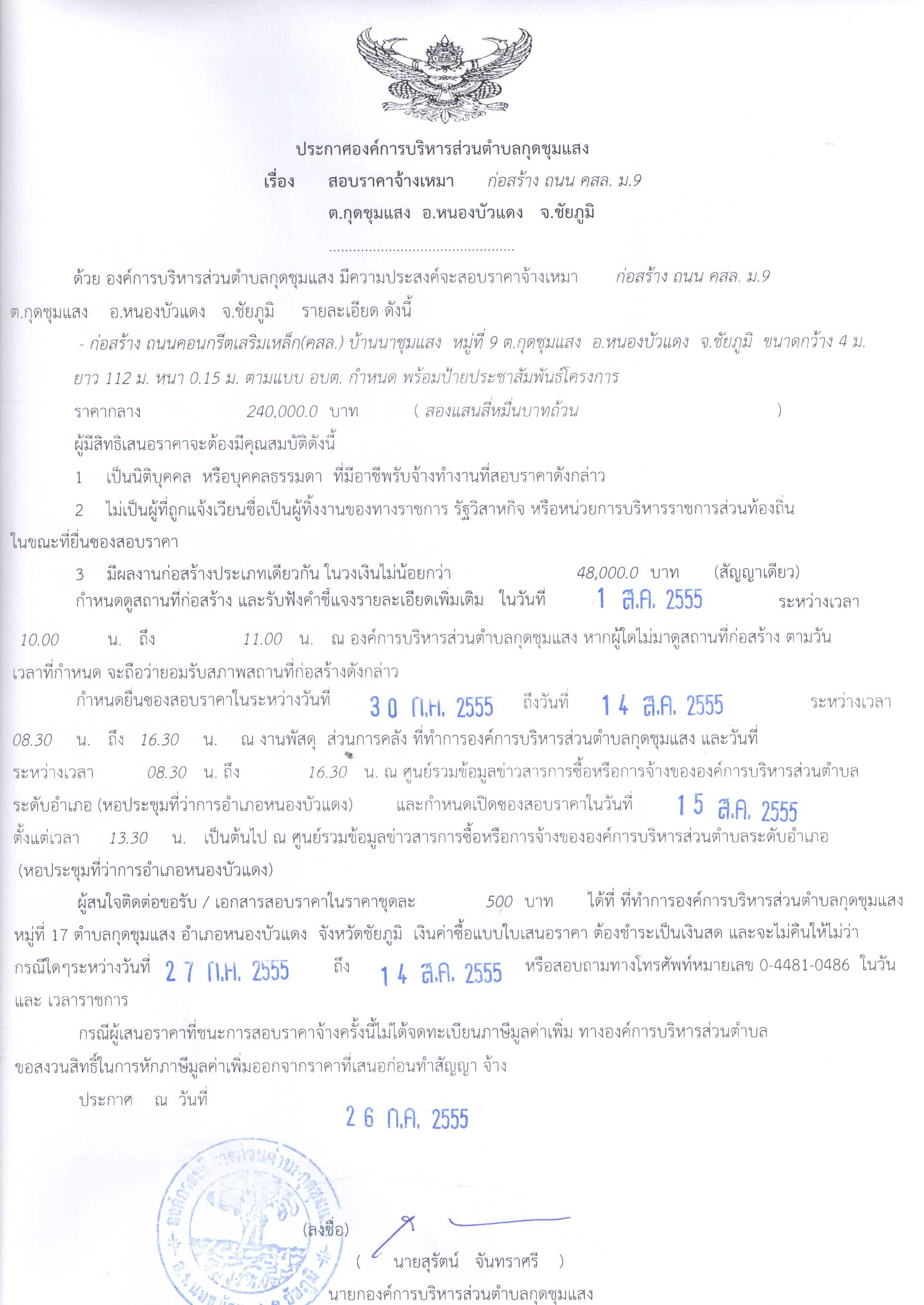 ประกาศ เรื่อง สอบราคาจ้างเหมา ก่อสร้างถนน คสล.หมู่ 9