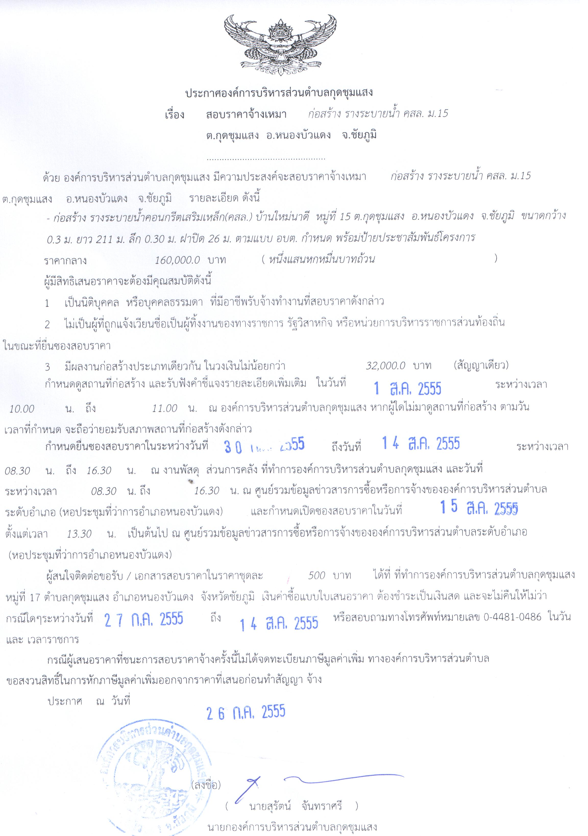 ประกาศ เรื่อง สอบราคาจ้างเหมา ก่อสร้างรางระบายน้ำ คสล.หมู่ 15