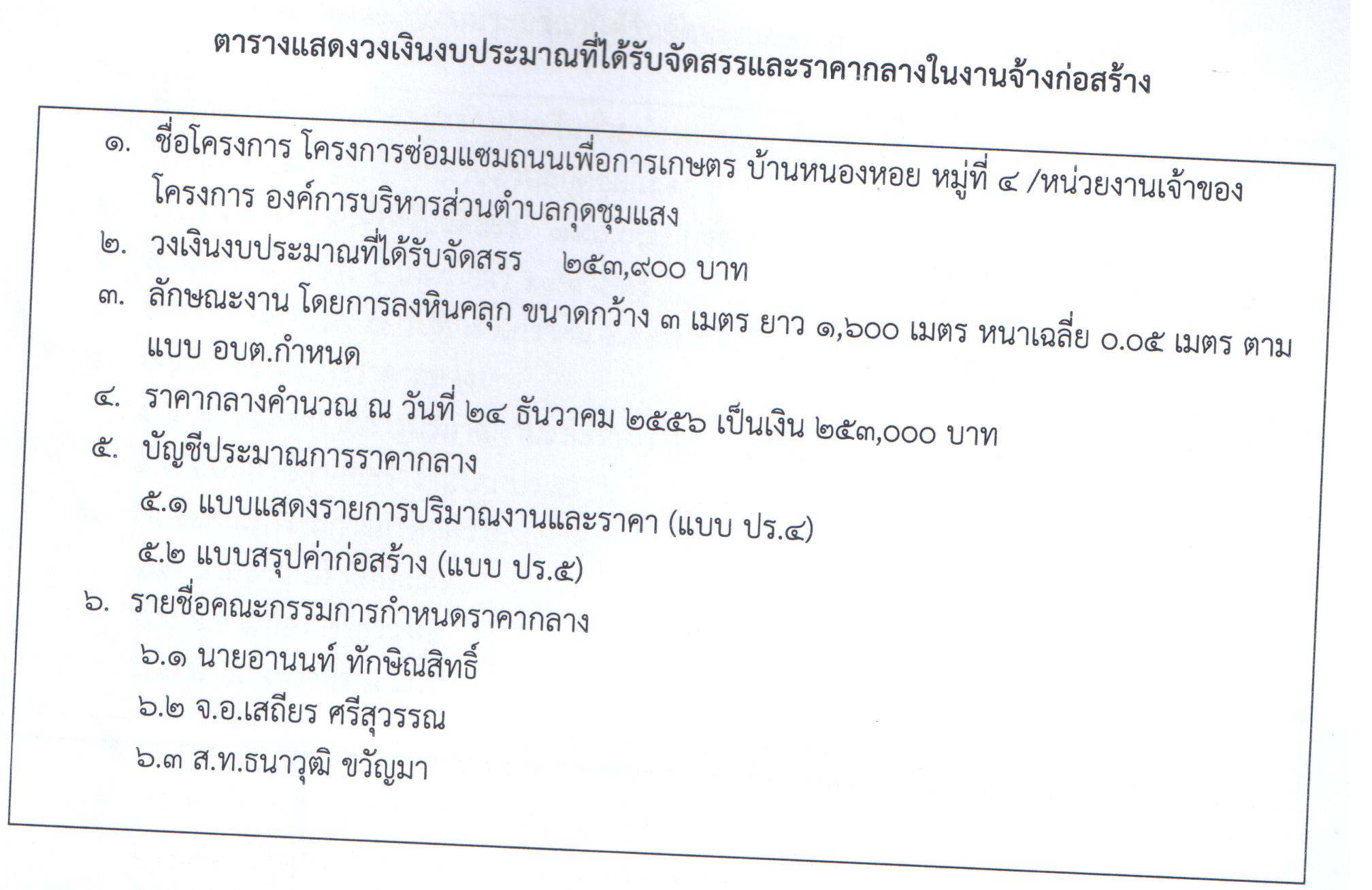 ราคากลางโครงการซ่อมแซมถนนเพื่อการเกษตร บ.หนองหอย ม.ที่4