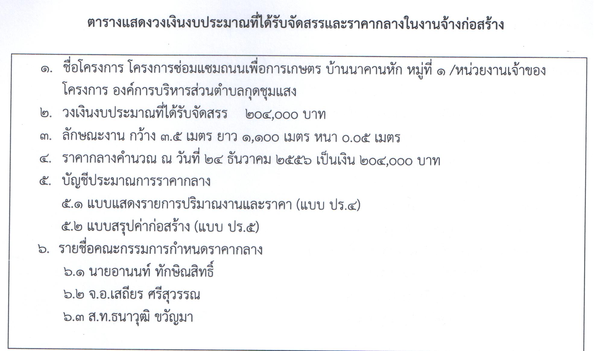 ราคากลางโครงการซ่อมแซมถนนเพื่อการเกษตร บ.นาคานหัก ม.1