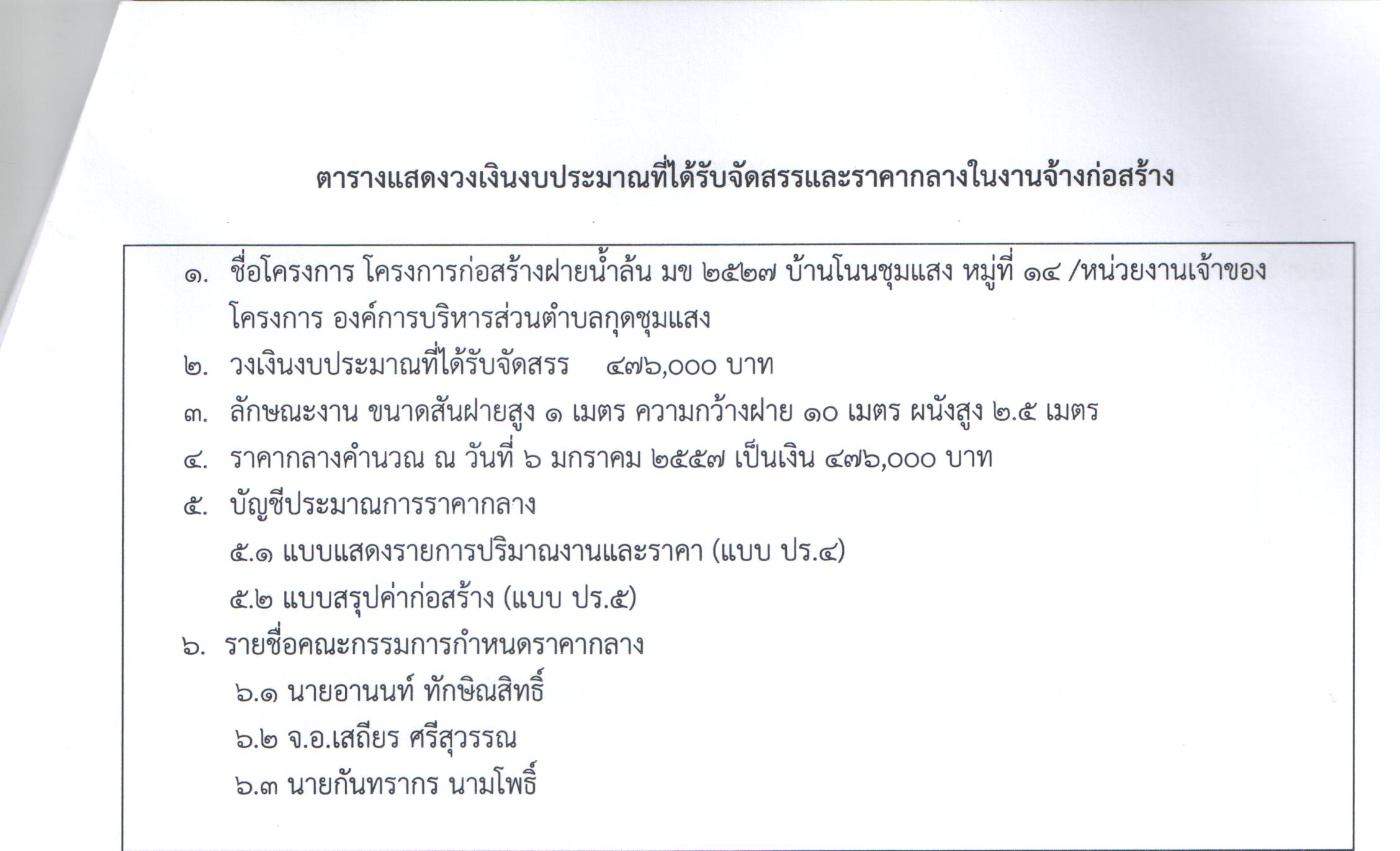 ราคากลางโครงการก่อสร้างฝายน้ำล้น บ.โนนชุมแสง ม.14