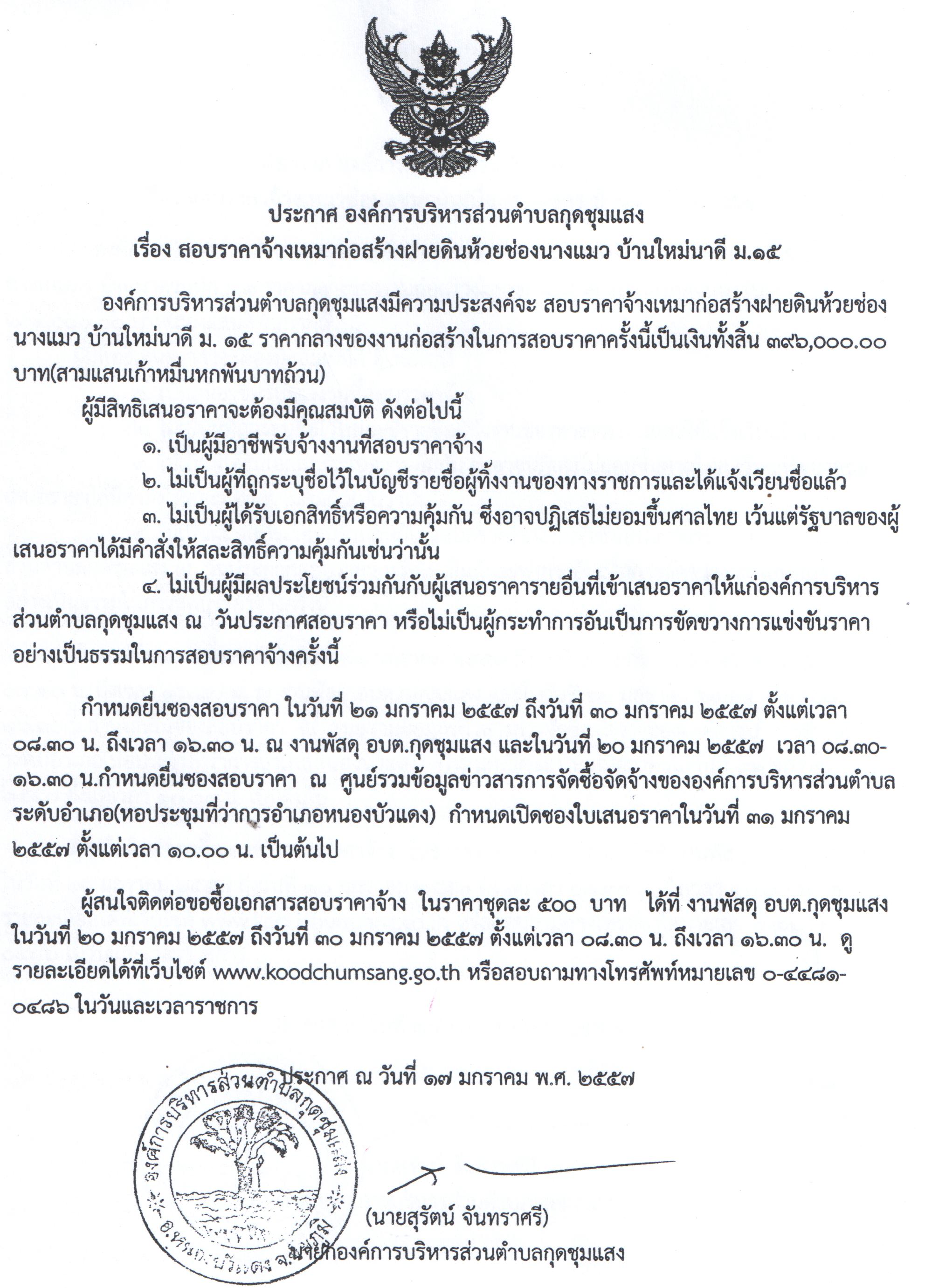 สอบราคาจ้างเหมาก่อสร้างฝายดินห้วยช่องนางแมว บ.ใหม่นาดี ม.15