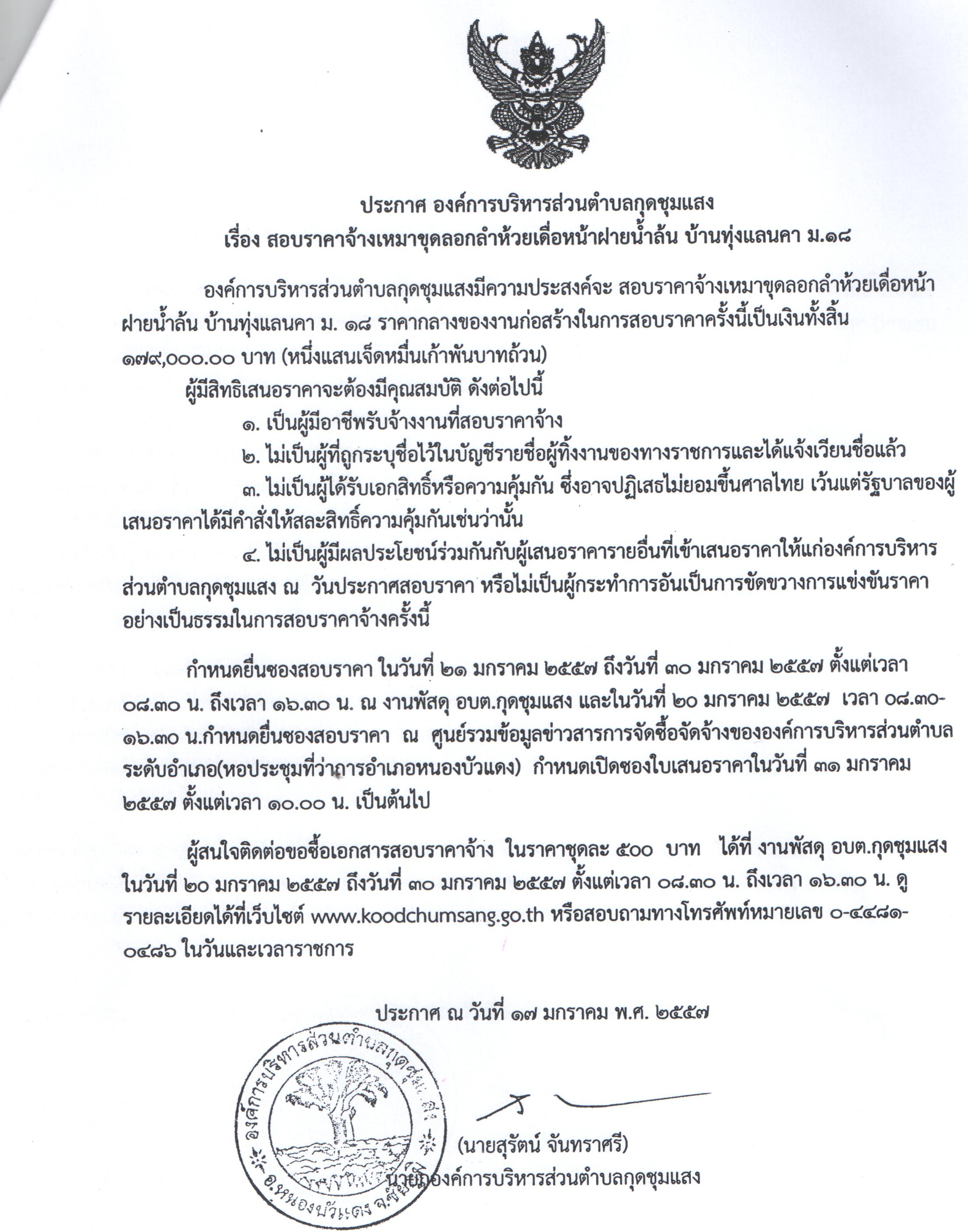 สอบราคาจ้างเหมาขุดลอกลำห้วยเดื่อหน้าฝายน้ำล้น บ.ทุ่งแลนคา ม.18